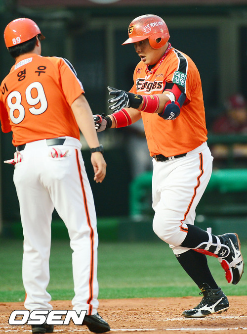 4일 오후 목동구장에서 열린 '2012 팔도 프로야구' 넥센 히어로즈와 한화 이글스의 경기에서 2회초 선두타석에서 한화 김태균이 좌월 솔로홈런을 날린 후 홈에서 이영우 코치와 하이파이브를 하고 있다.