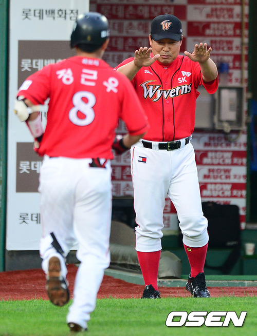 4일 오후 부산 사직구장에서 열린 2012 팔도 프로야구 롯데 자이언츠와 SK 와이번스의 경기, 3회초 2사에서 SK 정근우가 선제 솔로포를 날리고 더그아웃으로 향하며 이만수 감독의 축하를 받고 있다.