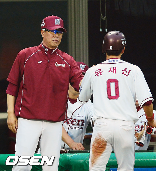 4일 오후 목동구장에서 열린 '2012 팔도 프로야구' 넥센 히어로즈와 한화 이글스의 경기에서 2회말 1사 주자 3루 넥센 장기영이 투수 앞 희생번트때 3루 주자 유재신이 홈으로 몸을 날리며 세이프된 후 덕아웃에서 김시진 감독과 하이파이브를 하고 있다.