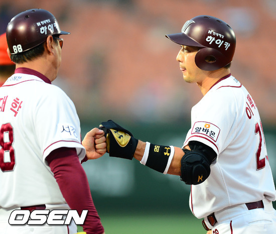 4일 오후 목동구장에서 열린 '2012 팔도 프로야구' 넥센 히어로즈와 한화 이글스의 경기에서 2회말 1사 주자 2루 넥센 이택근이 중견수 앞 1타점 적시타를 날린 후 1루에서 심재학 코치와 하이파이브를 하고 있다.