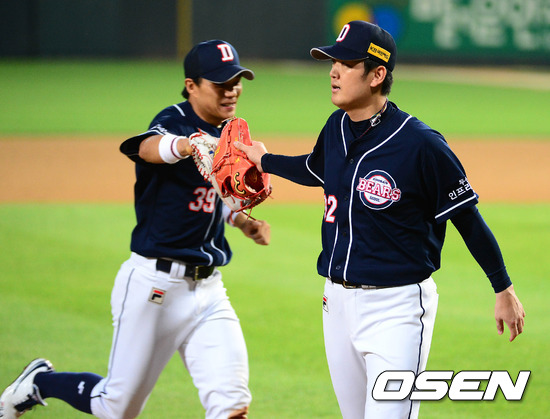 4일 오후 광주 무등야구장에서 열린 '2012 팔도 프로야구' KIA 타이거즈와 두산 베어스의 경기, 5회말 1사 1루 두산 김선우가 KIA 이준호를 병살로 처리하고 더그아웃으로 가며 이종욱과 하이파이브를 하고 있다.