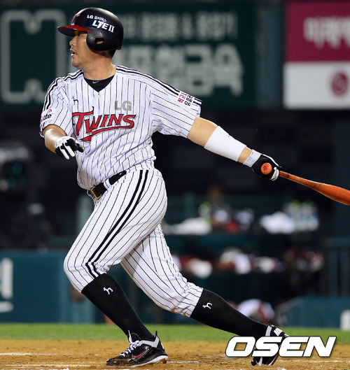 4일 오후 서울 잠실구장에서 열린 '2012 팔도 프로야구' LG 트윈스와 삼성 라이온즈의 경기 6회말 2사 1루 최동수가 좌익수 앞 1루타를 치고 있다.