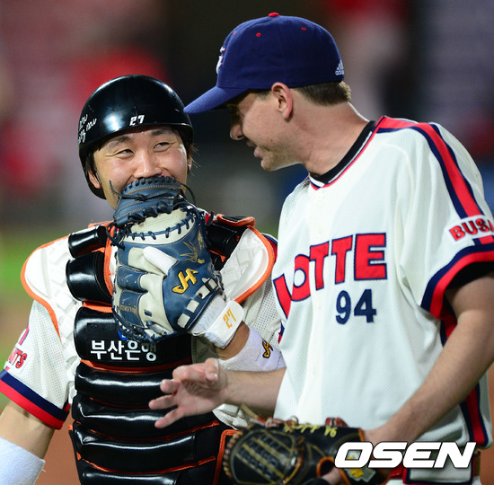4일 오후 부산 사직구장에서 열린 2012 팔도 프로야구 롯데 자이언츠와 SK 와이번스의 경기, 6회말 수비를 마친 롯데 용덕한과 사도스키가 이야기를 나누며 더그아웃으로 향하고 있다.