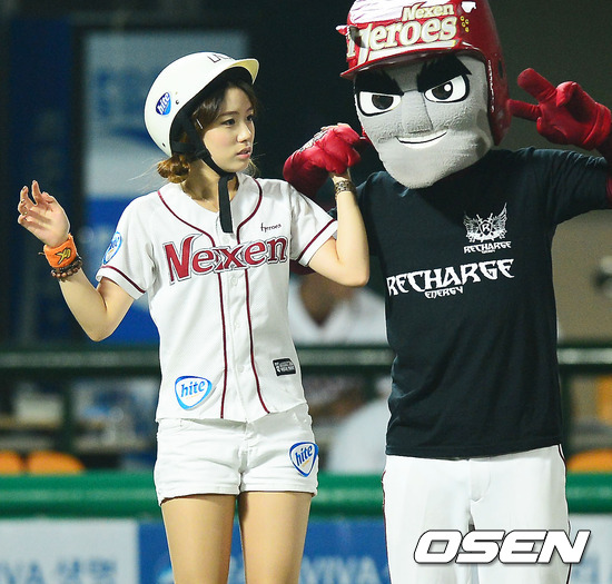 4일 오후 목동구장에서 열린 '2012 팔도 프로야구' 넥센 히어로즈와 한화 이글스의 경기에서 7회초를 마친 후 넥센 턱돌이가 넥센 배트걸 민수진을 그라운드로 데리고 나와 포즈를 취하고 있다.