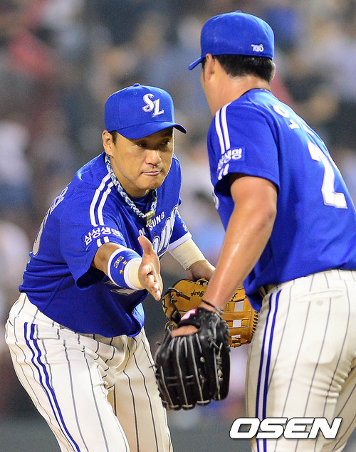 4일 오후 서울 잠실구장에서 열린 '2012 팔도 프로야구' LG 트윈스와 삼성 라이온즈의 경기 종료후 이승엽과 오승환이 하이파이브를 하고 있다.
