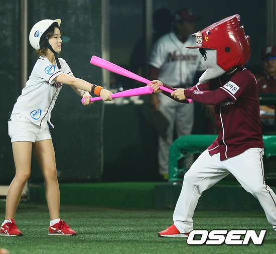4일 오후 목동구장에서 열린 '2012 팔도 프로야구' 넥센 히어로즈와 한화 이글스의 경기에서 8회초를 마친 후 넥센 턱돌이가 넥센 배트걸 민수진을 그라운드로 데리고 나와 번트 자세를 가르치고 있다.