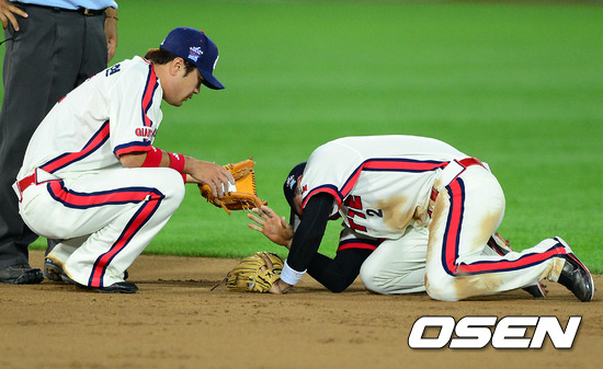 9회초 무사에서 롯데 조성환이 SK 김재현의 타구를 처리하다 부상을 당하고 고통을 호소하고 있다. 결국 박준서와 교체./jpnews@osen.co.kr