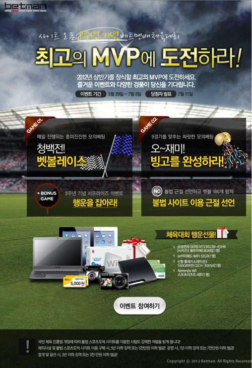 국민체육진흥공단(www.kspo.or.kr)이 발행하는 체육진흥투표권 수탁사업자인 스포츠토토 공식 온라인 발매 사이트 베트맨(betman.co.kr)이 사이트 오픈 8주년을 기념해 마련한 '베트맨 체육대회 최고의 MVP에 도전하라!' 이벤트의 마감이 다가왔다.