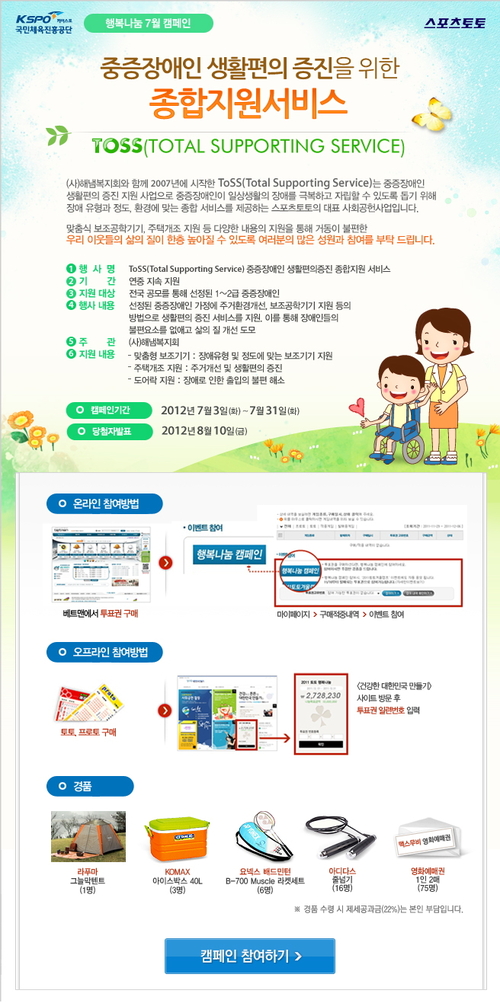 행복나눔 캠페인은 매달 1천만원을 목표로 스포츠토토 팬들의 기부금을 모아 어려운 이웃을 돕는 이벤트로, 'ToSS(Total Supporting Service)는 2007년부터 스포츠토토와 사단법인 해냄복지회가 중증장애인의 삶의 질 향상과 생활편의 증진을 위해 진행해 온 사업이다.