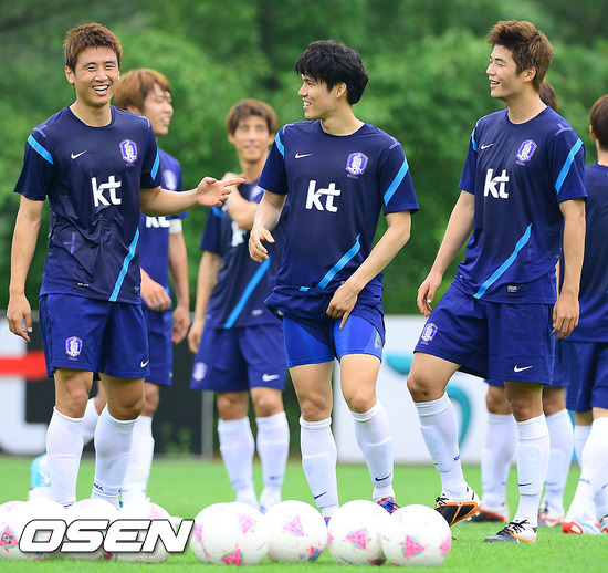 5일 오전 경기도 파주 NFC에서 2012 런던올림픽 대표팀의 공개 훈련에서 크로스연습때 구자철과 김창수, 기성용이 미소 짓고 있다.