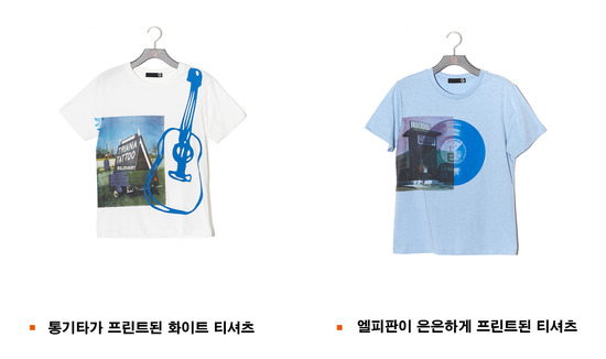 강렬한 컬러대비를 이루는 모노톤의 그래픽 티셔츠와 레더 재킷, 그리고 시스루 효과가 있는 얇은 니트 상의 등이 밤 공연과 낮 공연 사이 다양한 연출과 온도 대처를 할 수 있는 핵심 아이템이다.