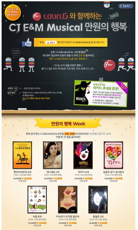 CJ E&M은 CJ E&M Musical 페이스북의 팬수 1만 명 돌파를 앞두고 'BC Loun.G 와 함께하는 CJ E&M Musical 만원의 행복'을 펼친다.