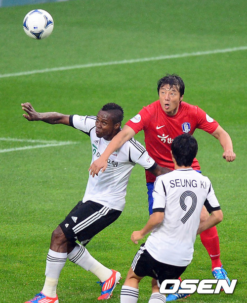 5일 오후 서울월드컵경기장에서 열린 '2002 월드컵 대표팀 초청 하나은행 K리그 올스타전 2012’전반 황선홍이 공중볼 다툼을 하고 있다.