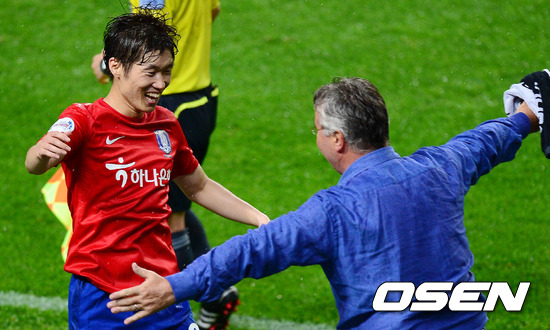 5일 오후 서울월드컵경기장에서 열린 '2002 월드컵 대표팀 초청 하나은행 K리그 올스타전 2012’전반 박지성이 골을 넣은 후 히딩크 감독과 포옹을 하고 있다.