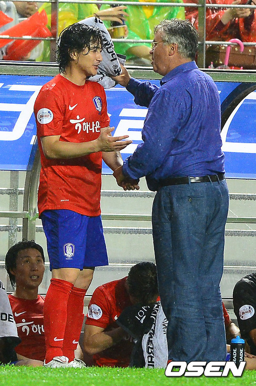5일 오후 서울월드컵경기장에서 열린 '2002 월드컵 대표팀 초청 하나은행 K리그 올스타전 2012’ 경기 하프타임 TEAM 2002 히딩크 감독이 패널티킥을 실축한 안정환에게 수건으로 장난치며 이야기를 나누고 있다.