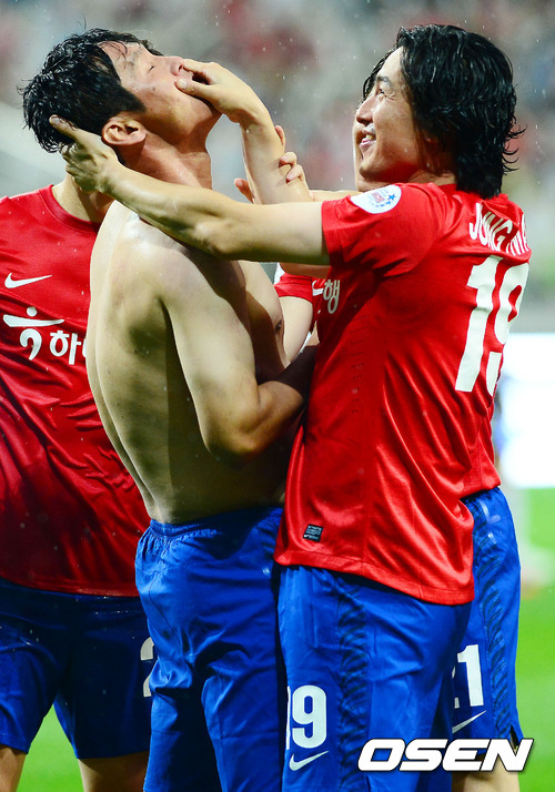 전반 'TEAM 2002'의 최용수가 팀 첫골을 넣고 발로텔리 세레머니를 따라하고 있다. / rumi@osen.co.kr