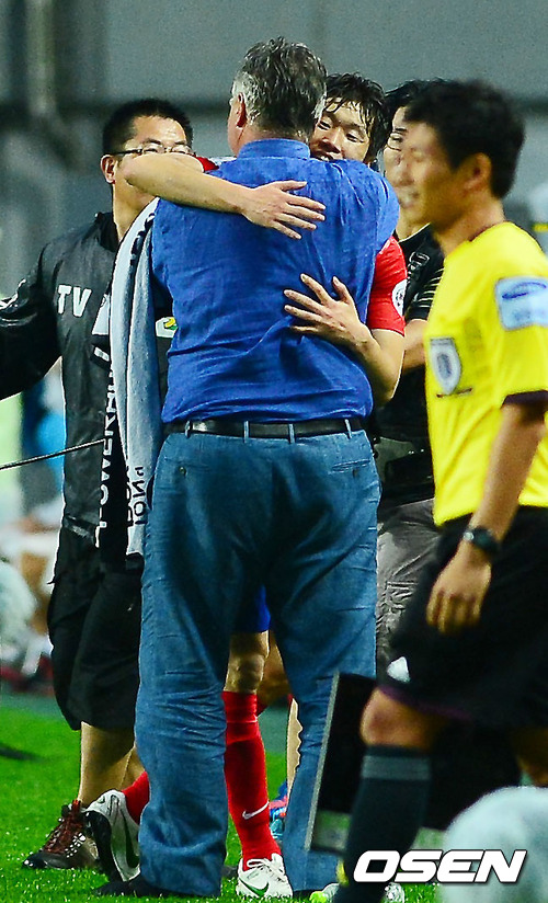 전반 'TEAM 2002'의 박지성이 팀 두번째 골을 성공시킨후 히딩크 감독과 포옹을 하고 있다. / rumi@osen.co.kr