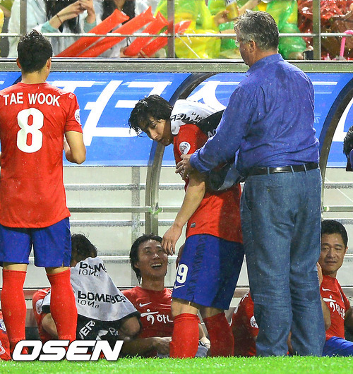 하프타임때 히딩크 감독이 승부차기 실축한 안정환에게 장난을 치고 있다 / soul1014@osen.co.kr