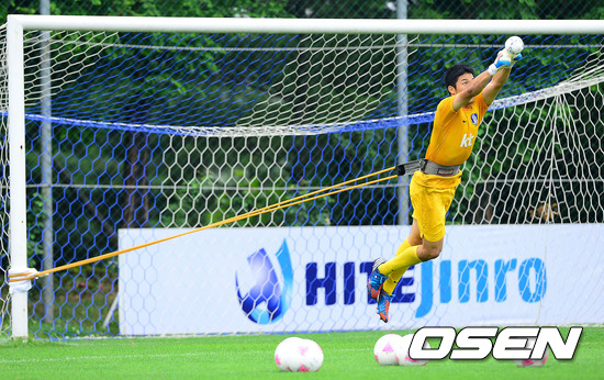 또 이와함께 골키퍼들은 '벤딩훈련'도 펼치고 있다. 고무줄을 허리에 묶고 슈팅을 막아내는 훈련을 하는 것. 움직임이 제한되지만 반복적으로 하면서 범위를 넓혀갈 수 있는 장점이 있다.