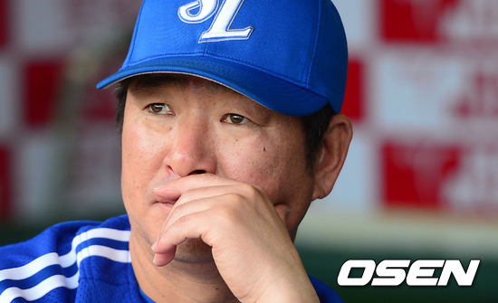 7일 오후 부산 사직구장에서 열린 '2012 팔도 프로야구' 롯데와 삼성의 경기, 경기에 앞서 삼성 류중일 감독이 취재진과 이야기를 나누며 생각에 잠겨 있다.