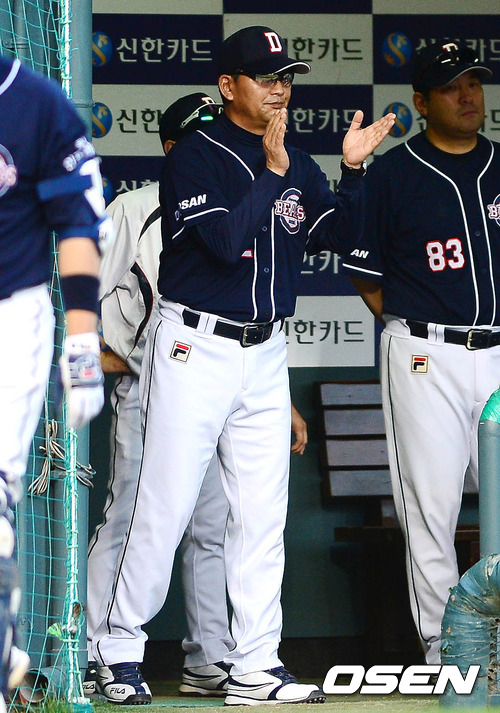 7일 오후 서울 잠실구장에서 열린 '2012 팔도 프로야구' LG 트윈스와 두산 베어스의 경기 8회초 2사 1루 오재원의 타석, 김진욱 감독이 선수들을 향해 박수를 보내고 있다.