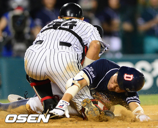 7일 오후 서울 잠실구장에서 열린 '2012 팔도 프로야구' LG 트윈스와 두산 베어스의 경기 11회초 2사 정수빈이 우중간 3루타를 친 후 홈으로 쇄도, 포수 실책으로 홈에서 세이프되고 있다.
