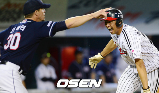 7일 오후 서울 잠실구장에서 열린 '2012 팔도 프로야구' LG 트윈스와 두산 베어스의 경기 11회말 1사 1,3루 윤요섭의 희생플라이, 3루 대주자 김광삼이 홈에서 세이프되고 기뻐하고 있다.