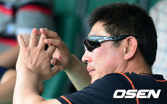 8일 오후 대전구장에서 열린 '2012 팔도 프로야구' 한화 이글스와 SK 와이번스의 경기, 경기전 한화 한대화 감독이 기자들이 사진을 찍자 쑥스러운듯 손으로 얼굴을 가리고 있다.