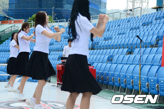 8일 오후 대전구장에서 열린 '2012 팔도 프로야구' 한화 이글스와 SK 와이번스의 경기, 경기전 한화 치어리더가 안무 동작 연습을 하고 있다.