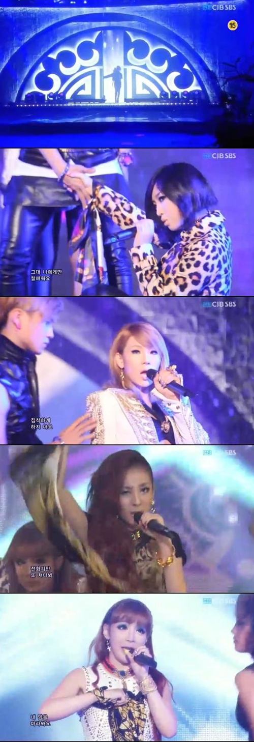 이날 2NE1은 호피무늬와 블랙, 화이트가 어우러진 의상은 팜므파탈 분위기를 자아냈다. 한손에 스카프를 묶고 흔들며 매혹적인 무대를 시작했다.