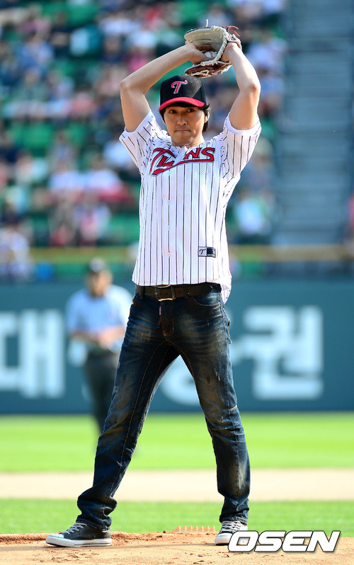8일 오후 서울 잠실야구장에서 열린 '2012 팔도 프로야구' 두산 베어스와 LG 트윈스의 경기에 앞서 배우 이필모가 시구를 하고 있다.