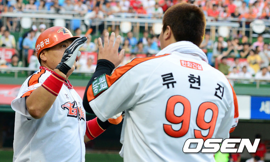 8일 오후 대전구장에서 열린 '2012 팔도 프로야구' 한화 이글스와 SK 와이번스의 경기, 6회말 무사에서 한화 김태균이 솔로포를 날리고 류현진과 하이파이브를 하고 있다.