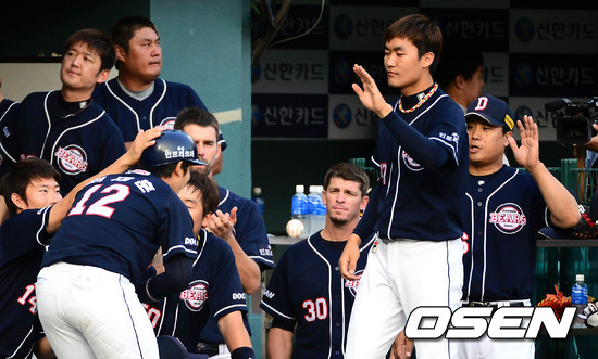 8일 오후 서울 잠실야구장에서 열린 '2012 팔도 프로야구' 두산 베어스와 LG 트윈스의 경기, 7회초 1사 3루 두산 윤석민의 희생플라이때 홈을 밟은 3루주자 최재훈이 더그아우에서 동료들의 축하를 받고 있다.