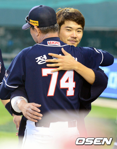 경기 종료, 두산 노경은이 정명원 코치와 포옹을 하고 있다. /ouxou@osen.co.kr