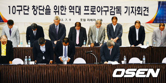 10일 개최되는 한국야구위원회(KBO) 이사회에 앞서 10구단 창단을 촉구하기 위해서 위해 전직 프로야구 감독들이 기자회견을 열었다.