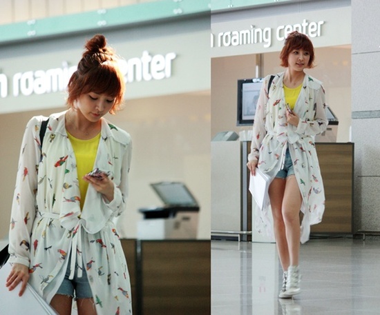 이날 정유미는 시원하면서도 편안한 스타일로 시선을 사로잡았다. 앙증맞은 앵무새 프린트가 돋보이는 화이트 쉬폰 버버리와 노란색 티셔츠에 핫 팬츠진을 매치한 다음 낮은 굽이 있는 운동화를 신어 실용성과 멋스러움을 강조했다.