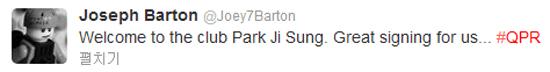 퀸스파크 레인저스(QPR)의 '악동' 조이 바튼(30)이 박지성의 입단에 대해 환영하는 메시지를 남겼다.
