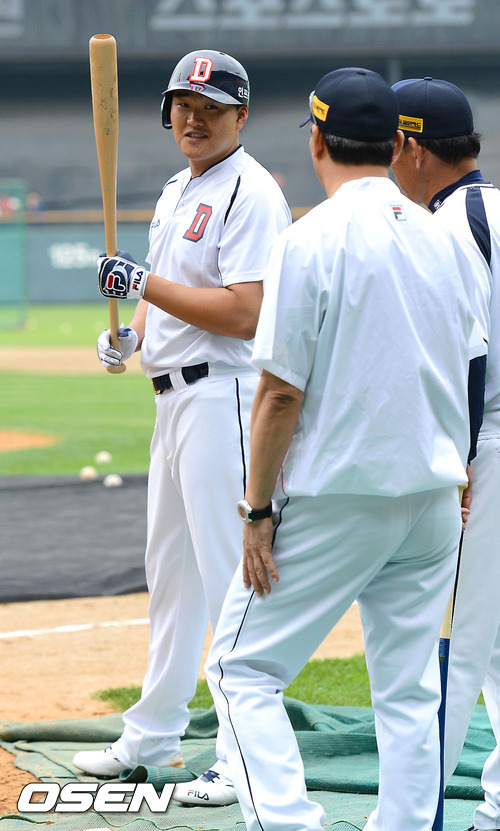 10일 오후 서울 잠실구장에서 열리는 2012 팔도 프로야구 두산 베어스와 한화 이글스의 경기 전 두산으로 트레이드된 오재일이 김진욱 감독과 이야기를 나누고 있다