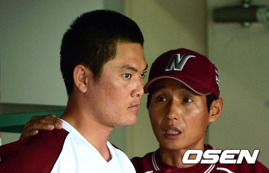 10일 오후 인천 문학야구장에서 열린 '2012 팔도 프로야구' SK 와이번스와 넥센 히어로즈의 경기에 앞서 두산에서 넥센 오재일과 트레이드 된 이성열이 염경엽 코치와 이야기를 나누고 있다.