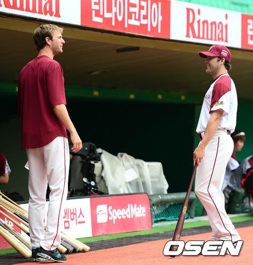 10일 오후 인천 문학야구장에서 열린 '2012 팔도 프로야구' SK 와이번스와 넥센 히어로즈의 경기에 앞서 넥센 벤헤켄과 나이트가 더그아웃에서 이야기를 나누고 있다.