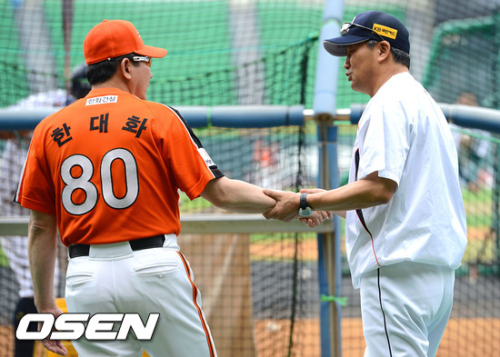10일 오후 서울 잠실구장에서 열리는 2012 팔도 프로야구 두산 베어스와 한화 이글스의 경기 전 두산 김진욱 감독과 한화 한대화 감독이 이야기를 나누고 있다.