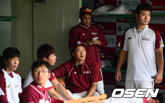 10일 오후 인천 문학야구장에서 열린 '2012 팔도 프로야구' SK 와이번스와 넥센 히어로즈의 경기에 앞서 넥센 선수들이 그라운드를 바라보고 있다.
