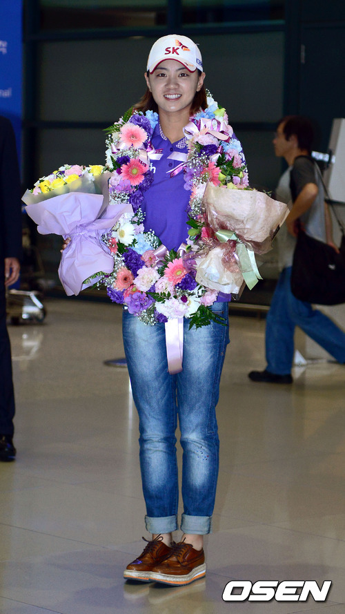미국 여자프로골프(LPGA)투어 US 여자오픈에서 우승한 최나연이 10일 오후 인천국제공항을 통해 입국 기념촬영을 하고 있다.