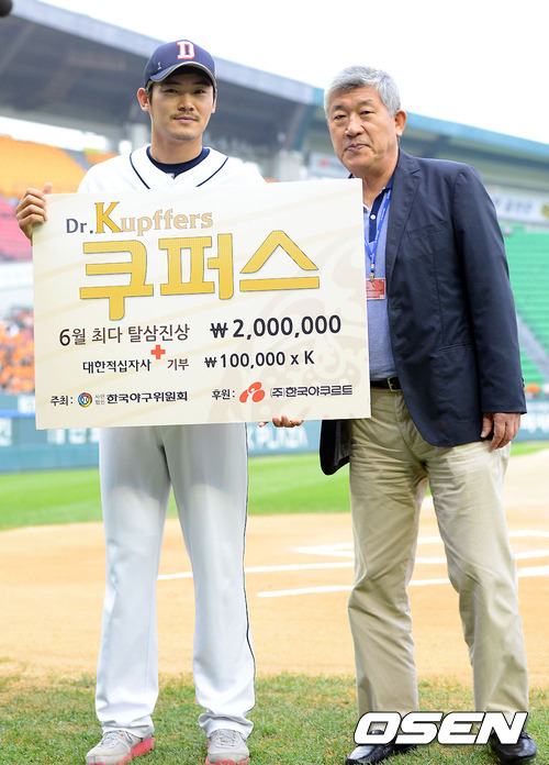 10일 오후 서울 잠실구장에서 열린 2012 팔도 프로야구 두산 베어스와 한화 이글스의 경기에 앞서 두산 노경은이 6월 최다 탈삼진상을 수상한 뒤 포즈를 취하고 있다.