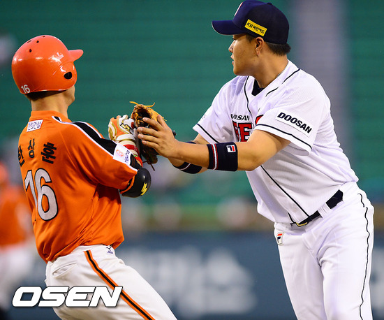 10일 오후 서울 잠실구장에서 열린 2012 팔도 프로야구 두산 베어스와 한화 이글스의 경기 3회초 1사 1,3루 한화 한상훈의 내야땅볼때 두산 오재일 1루수가 타자 한상훈을 태그아웃하고 있다.