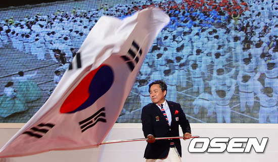 이기흥 선수단장이 전달받은 단기를 흔들고 있다.