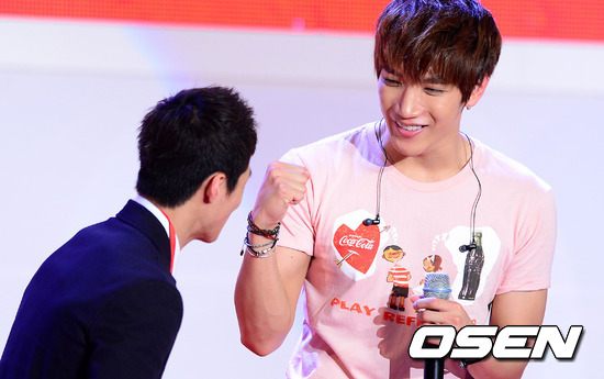 결단식을 마치고 축하공연에서 2PM 준수가 체조 대표 양학선에게 파이팅을 하고 있다.
