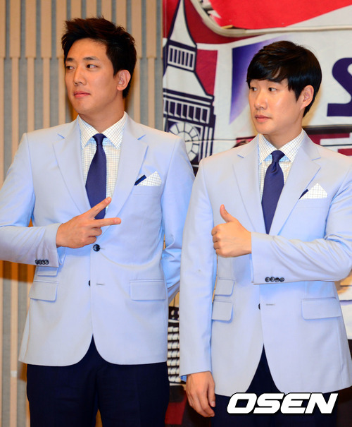 2012 런던올림픽 방송단 기자회견이 11일 오후 서울 SBS 목동사옥에서 진행되 김환, 배성재 캐스터가 포토타임을 갖고 있다.