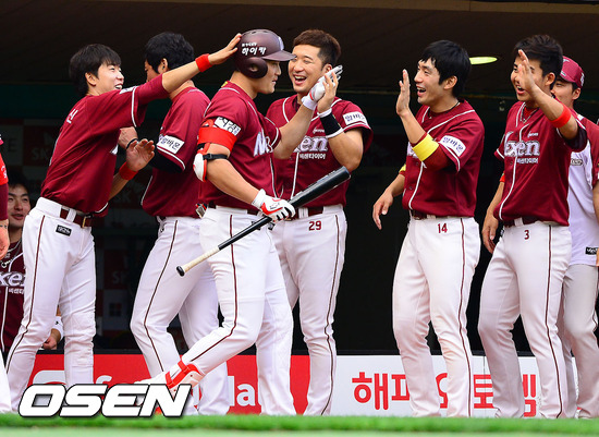 11일 오후 인천 문학구장에서 열린 2012 팔도 프로야구 SK 와이번스와 넥센 히어로즈의 경기 2회말 1사 넥센 이성열이 우측 폴대를 넘기는 파울 타구를 날렸다. 1루심이 홈런으로 판정하자 이성열이 베이스를 돌며 홈을 밟은 뒤 동료들의 축하를 받고 있다.