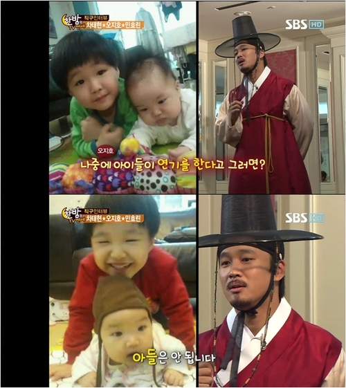 차태현은 지난 11일 방송된 SBS 연예정보프로그램 ‘한밤의 TV 연예’에서 오지호로부터 “나중에 아이들이 연기를 한다면 어떻게 하겠느냐”는 질문을 받고 “우리는 둘 중에 한명 밖에 안 된다”고 답했다.